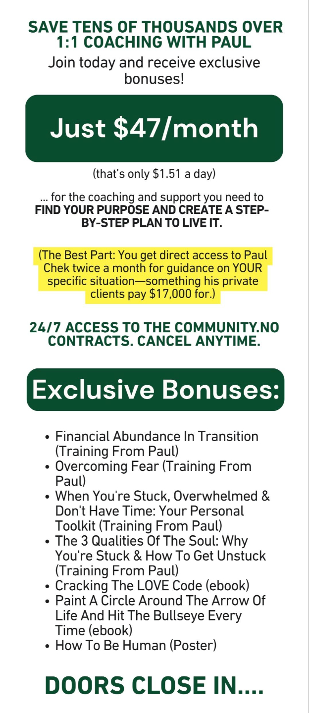 Hi, my name is Paul Chek, and together we’ll find your soul's unique approach to finding love that prospers, health that never wanes, and freedom that takes you further. How do I know this is possible? Because I live true to these words every day and I've helped many do that same.Â